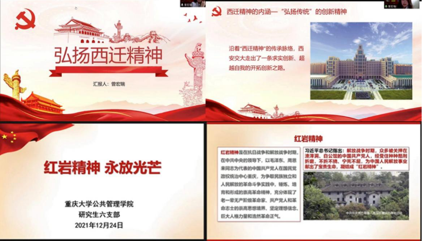 学习党史、增进信心、扎牢思想根基、提升战疫动力。党支部宣传委员曾宏瑞、重庆大学公管学院研究生六支部书记何薇老师依次进行了关于西迁精神与红岩精神的党史学习教育专题宣讲。