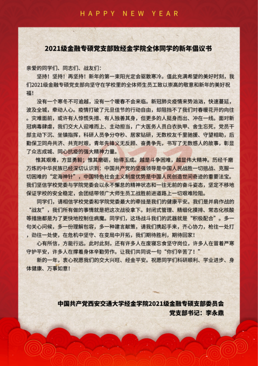 全体同学发出新年倡议书,为全体经金学子发送祝福的同时倡导同学们坚信学校党委与学院党委会坚定不移地保证我们的安全稳定,会团结带领广大师生员工战胜前进道路上一切艰难险阻;倡导同学们积极配合,多一句关心问候,多一份理解包容,多一种建言献策,携起手来,齐心协力,枪往一处打,劲往一处使!倡导同学们向冒着严寒坚守岗位、守护平安的防疫人员说一句“你们辛苦了!”
