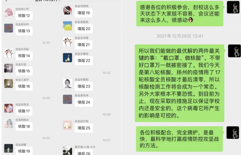 在收到上级疫情防控安排部署的第一时间,党支部迅速召开支委会研究党、团支部参与抗疫的方案,指导1161团支部和1162团支部迅速传达学校和学院相关要求,要求同学们提高站位、保持冷静、积极配合、主动奉献。党支部书记李永鼎强调,积极配合防控政策是拥有政治意识与大局意识的实际表现,要坚定我们的制度自信,携起手来、齐心协力,坚信我们一定能打赢这场无声的战斗。各团支部通过召开疫情防控线上动员会,细化党员联系同学制度、建立健康日报与核酸检测接龙汇报方法,班级同学的健康状况能够第一时间做到“全掌握、零遗漏”。