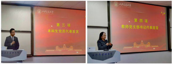 统计系党支部书记张慧芳教授作为教工党支部书记代表发言。她表示,师生党建共创是落实“立德树人,教书育人”的重要举措。开展形式多样、内容丰富的师生联建活动,能够增强基层党组织活力,助力学生成长成才。教师支部和教师党员不仅传授专业知识,还要主动关心学生的日常学习和生活,在思想教育、心理健康、人生规划、解决困难上开展帮扶指导。通过师生之间共建、共学、共促,使本科生在四年学习过程中思想、政治、文化、教育、专业知识等方面得到全面发展。
