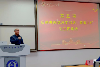 启德书院党总支书记、院务主任张王民讲话表示,这次本科生新支部的成立,标志着以党建为抓手,双院协同育人进入新的阶段。现在按照专业进行划分,有利于以专业为背景促进融合发展,期待取得更大成绩。希望同学们在新的支部中,进一步提升工作质量和工作规范,主动向学院老师请教、学习,通过师生共建交流,形成亦师亦友的良好融合关系,促进同学们的健康发展和学业进步。