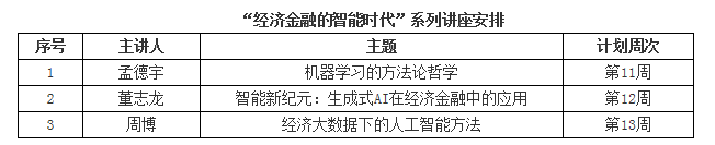 在数字化转型加速的时代背景下,智能技术正以前所未有的速度改变着经济金融领域的理论与实践。为帮助本科生更好地理解这些变化,学院推出了“知新”讲坛之“经济金融的智能时代”系列讲座。本期共邀请了三位相关研究领域的教师,开展聚焦智能技术前沿的系列讲座,每期讲座具体安排另行通知,欢迎各位同学积极参与。