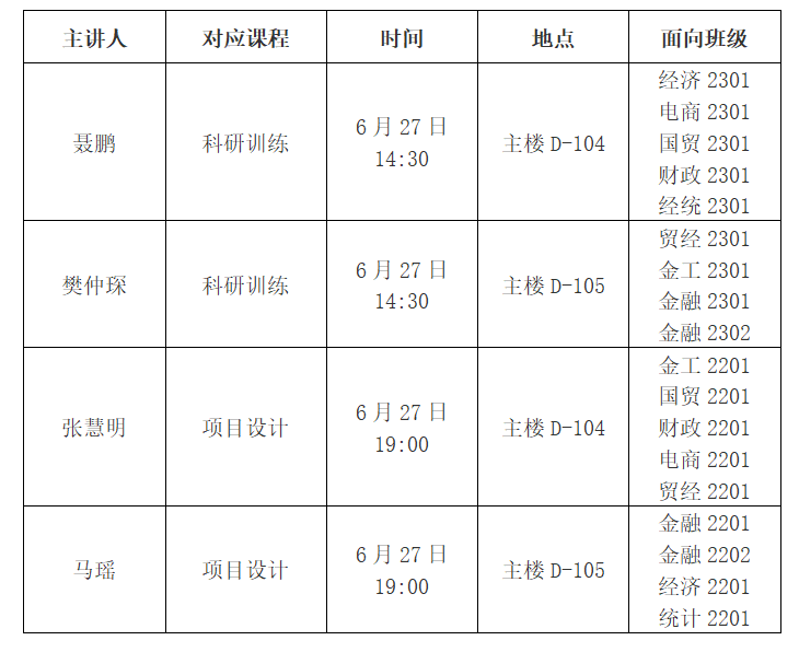 本科生论文写作能力,全面提高本科毕业论文质量,学院依托培养方案集中实践环节的《科研训练》与《项目设计》两门必修课程,开设“论文写作能力强化”系列讲座。内容主要涵盖论文写作的选题、基本框架、资料搜集、数据分析,以及论文的规范格式等,通过系列讲座夯实集中实践环节的理论讲授,为本科生毕业论文撰写打好基础,系列讲座具体安排如下: