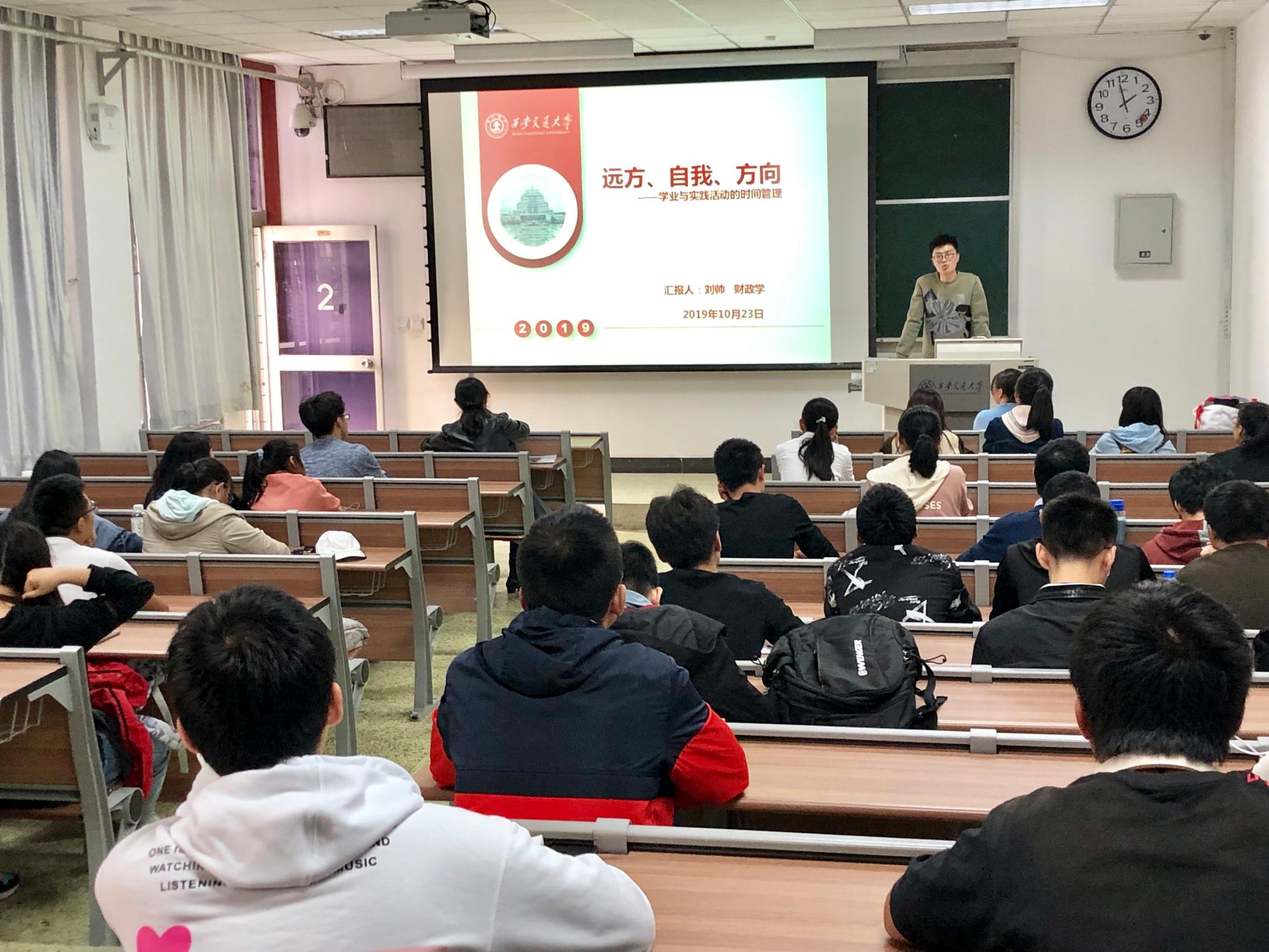 2019年10月23日,“知新讲坛”之学习经验交流会第二期在西配102举行。经济99班班主任张雅丽副教授主持,2016级财政学专业刘帅、高慧敏和张学智三位同学以“远方、自我、方向”为主题,与大家分享了自己大学三年的学习经验,三位主讲人均已保送至91porn