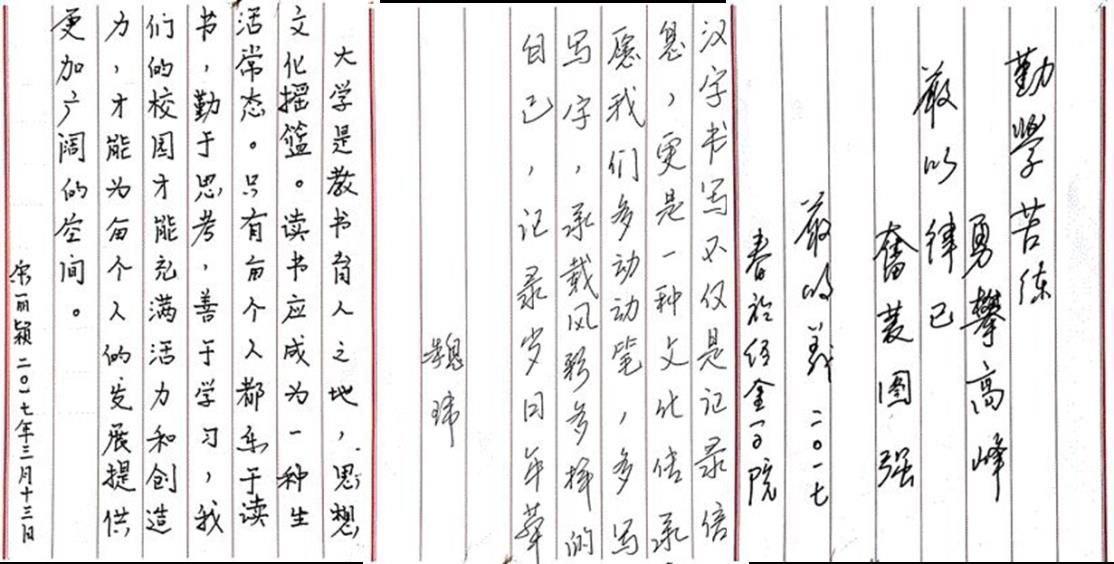 “见字如面”活动的成功举办,不仅仅是作为一项丰富大家课余生活的活动,更重要的是其背后的意义。以笔书写——针对当前提笔忘字的现象让同学们再一次认识中国汉字的坚毅之美,不要忘记中国的传统文化。分享文字——告诉同学们总有一段文字,影响生命的成长,阅读是我们每个人应该培养的习惯。见字如面,在同学们中传递着无声的精神力量。