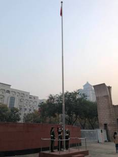 7点30分,升旗仪式正式开始,升旗手正在做最后的准备工作。迎着朝阳,国旗护卫队成员迈着铿锵的步伐来到了国旗台下,全场一片肃静。在激昂的《义勇军进行曲》中,护旗手振臂一挥,鲜艳的五星红旗随风展开,升旗手随之将五星红旗徐徐升起,五星红旗在晨曦中迎风飘扬在旗杆顶端。