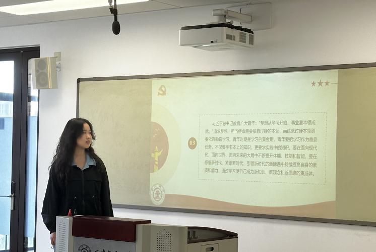 随后,宣讲团成员李家易、张焮越、赵依哲、石敏颖、太宇、赵斌、黄颖奇七位同学也分别进行了精彩的宣讲展示。李家易以“后浪滔滔上,青年亦铿锵”为主题,分享了《论党的青年工作》的学习心得,并通过徐枫灿、田利明、宋玺和张雨霏等优秀青年的事迹,激励同学们携手共进,为时代书写华章。张焮越围绕“时代的共鸣:青年与思想同行”的主题,引导大家深入学习《习近平与大学生朋友们》,呼吁同学们将个人梦想融入国家发展大局,为实现中国梦贡献青春力量。赵依哲则从历史、文化和生态等多个角度,全面阐述了中国共产党百年奋斗的辉煌历程和习近平新时代中国特色社会主义思想的核心要义,鼓励同学们志存高远,不断提升自身修养,为中华民族的伟大复兴贡献力量。