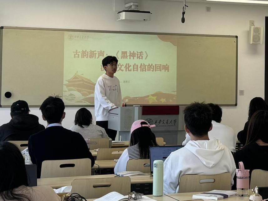 活动伊始,经策宣讲团副团长郭博文以时下热门的IP“黑神话:悟空”为引子,巧妙地引入文化自信这一核心议题。他详细阐述了习近平总书记关于文化自信的重要指示,指出文化自信是更为基础、广泛、深厚的自信。郭博文从游戏的文化背景、文化符号的运用以及新时代青年如何提升文化自信等多个维度进行宣讲,鼓励同学们要坚决抵制“文化入侵”,积极传承和弘扬中华优秀传统文化,坚定文化自信。