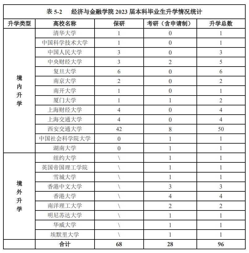 2023届本科生第一批毕业235人,其中68人保研至境内知名高校、28人通过考研或申请已被境内外各大高校录取,共计96名本科生升学至国内外知名学府继续攻读研究生,升学率达41%,升学成绩突出;就业136人,去向为银行、金融、地产、互联网、公务员或事业单位等,其中56人进入国家机关或国有企业、国资委直属央企、世界500强或中国500强等重点就业单位(见表5-2)。