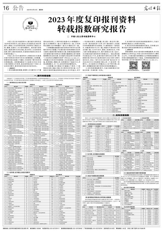中国人民大学书报资料中心复印报刊资料有近100种学术系列刊,是从国内公开出版的近4000种期刊(含集刊)和报纸上精选人文社科研究成果,并按学科门类进行分类、编辑、出版的二次文献专题期刊。复印报刊资料客观上兼具资料与评价功能,成为评价人文社科研究成果、期刊、教学科研机构、作者等学术影响力和水平的参考依据之一。该转载指数至今已连续24年在《光明日报》等媒体公开发表,基本客观地反映了中国人文社科学术期刊、教学科研机构的学术研究水平,受到社会各界高度关注,产生了广泛的社会影响。