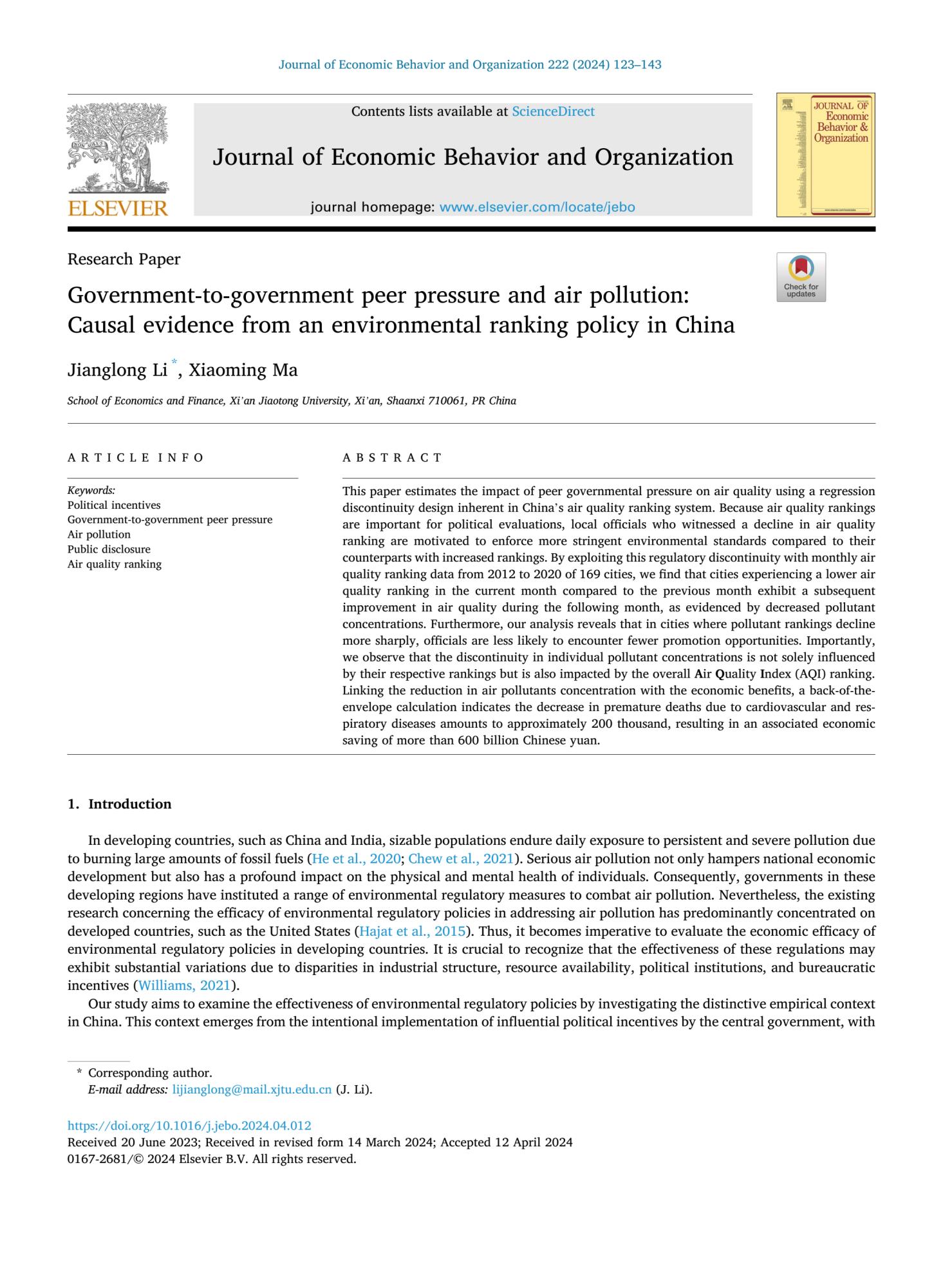 上述研究成果近期以Government-to-Government Peer Pressure and Air Pollution: Causal Evidence from an Environmental Ranking Policy in China为题被行为和组织经济学国际顶级期刊Journal of Economic Behavior & Organization(JEBO)正式接收,李江龙教授为该文第一作者,91porn