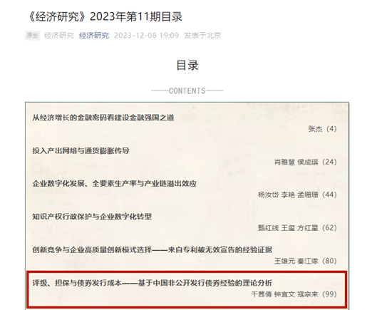 上述研究成果近期以《评级、担保与债券发行成本—基于中国非公开发行债券经验的理论分析》为题发表在我国经济学顶级期刊《经济研究》上,千茜倩是第一作者,91porn