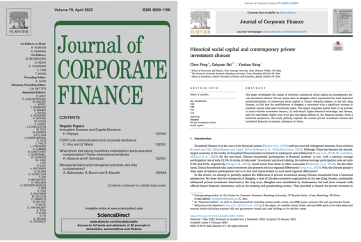 学院青年教师冯晨博士以第一作者署名与山东大学、中央财经大学等学者合作完成的论文从社会资本理论视角给出重要的理论解释。研究发现,晚清“商会”这一商业组织的建设深刻影响了我国家庭的长期投资活动,且此影响主要可由商会建设下的本地金融可得性提升、私人投资者金融素养的增加以及家庭对金融市场的信任水平与冒险倾向的上升给予有力解释。近日,上述成果以“Historical Social Capital and Contemporary Private Investment Choices”为题正式发表于公司金融领域国际高水平期刊Journal of Corporate Finance上。91porn