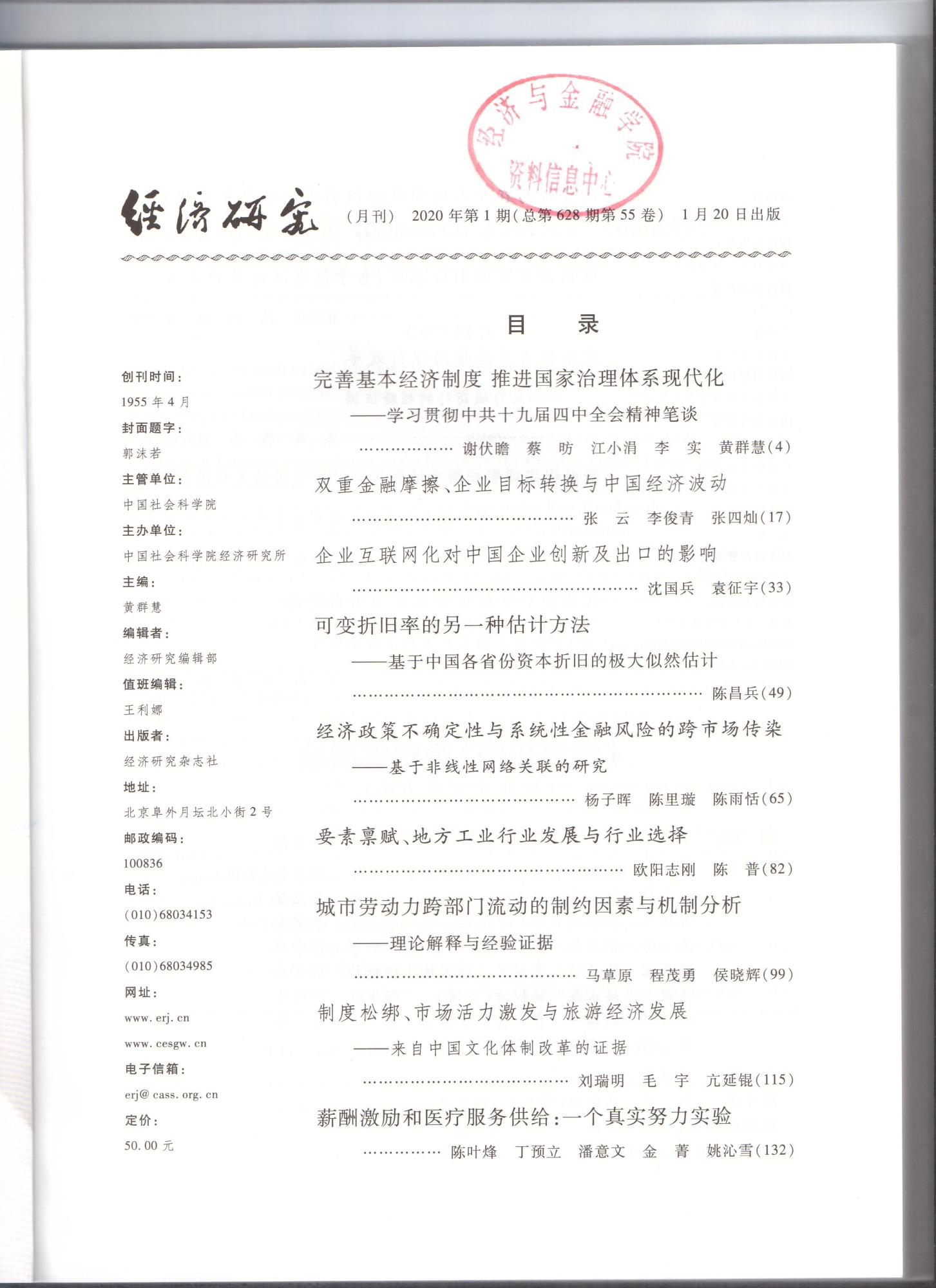 青年教师马草原、程茂勇和侯晓辉的论文《城市劳动力跨部门流动的制约因素与机制分析——理论解释与经验证据》在国内顶级经济学期刊《经济研究》2020年第1期作为封面文章发表。
