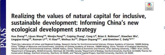 Title:Realizing the values of natural capital for inclusive, sustainable development: Informing China's new ecological development strategy,PNAS, 2019, 117(17): 8623-8628.