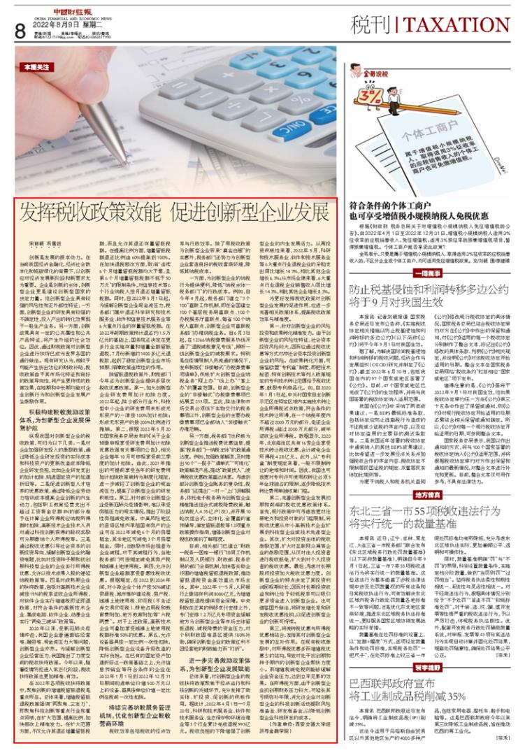 在2022年各项税收扶持政策中,聚焦创新的增值税留抵退税是重点所在。总体来看,增值税留抵退税政策强调“两聚焦、三发力”,即聚焦科技创新等重点行业和重点领域,在扩大范围、提高比例、加快频次上精准发力。在扩大范围方面,不仅允许其退还增量留抵税额,而且允许其退还存量留抵税额。在提高比例方面,增量留抵税额退还比例由60%提高到100%。在加快退税频次方面,取消“连续6个月增量留抵税额均大于零,且第6个月增量留抵税额不低于50万元”的限制条件,对信息技术等6个行业纳税人按月退还增量留抵税额。同时,自2022年5月1日起,为缓解创新型企业现金流压力,税务部门集中退还科学研究和技术服务业、软件和信息技术服务业等6大重点行业的存量留抵税额。在2022年前期政策预计退还约1.5万亿元的基础上,国务院还决定在更多行业实施存量和增量全额留抵退税,7月份新增的1400多亿元退税款,起到了稳定创新型企业市场预期、保障政策连续性的作用。