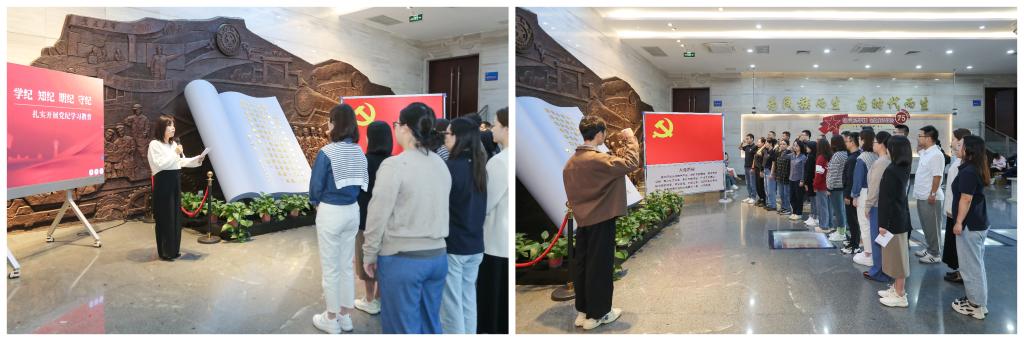 随后,同学们来到位于学校南侧的西迁博物馆,在一楼序厅举行了2024级MBA临时党支部成立仪式。91porn 党委副书记刘小溪宣读了《关于2024级MBA临时党支部成立的决定》并讲话,她寄语党员同学们勇担职责使命、强化思想引领、注重团结协作、坚持群众路线,充分发挥先锋模范和战斗堡垒作用。MBA(数字金融方向)临时党支部书记孙晓燕同学作为党员代表发言,她表示将通过党班共建,进一步增强班级凝聚力,提升班级同学的归属感与认同感。最后,在组织委员李睿同学的带领下,全体党员举起右拳,齐声重温入党誓词,铿锵有力的誓言,不仅是对初心的深情回望,更是对未来的坚定承诺。