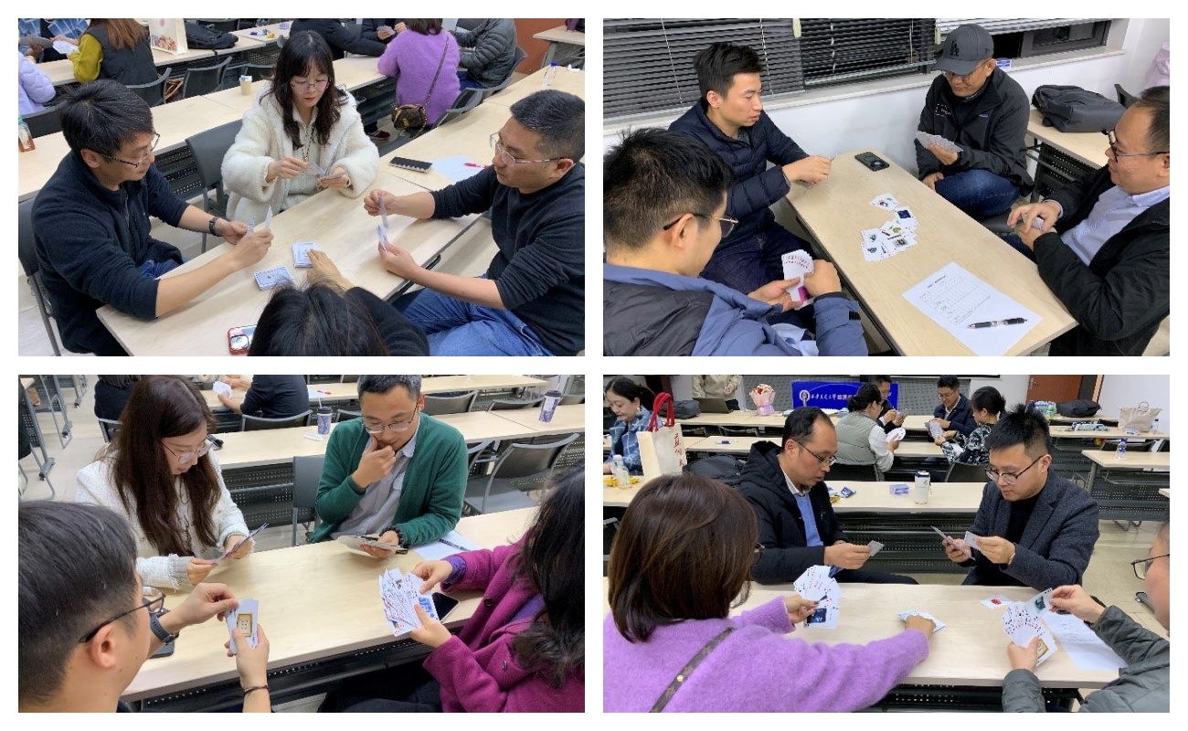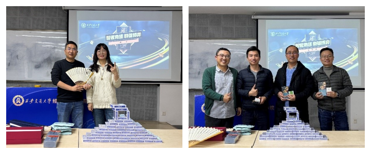 选手们迅速进入状态,有的眉头紧锁,专注地分析手中的牌型与可能的出牌策略;有的面带微笑,显得胸有成竹,仿佛一切尽在掌握之中。随着时间的推移,比赛逐渐进入白热化阶段,激烈的脑力比拼引得现场阵阵惊呼。最终经过两轮的惨烈厮杀,胡续耀同学力压群雄,一举夺魁,赢得 “掼王”奖杯及书法家周真源题字的书法折扇;马志宏、何亮、苏召辉等同学遗憾落败,意犹未尽,约定下次重整旗鼓、再较高下。在欢笑声中,比赛落下帷幕。