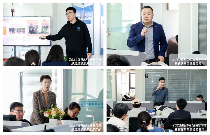 副院长沈灏教授、MBA中心副主任任小静老师、MBA企业导师、博硕律师事务所高级合伙人王娟老师带队参加了此次活动。金诺文化董事长韩明宏、副总经理王腾、项目部经理程汉、行政部经理徐爱娜等企业负责人代表与师生们进了座谈交流。